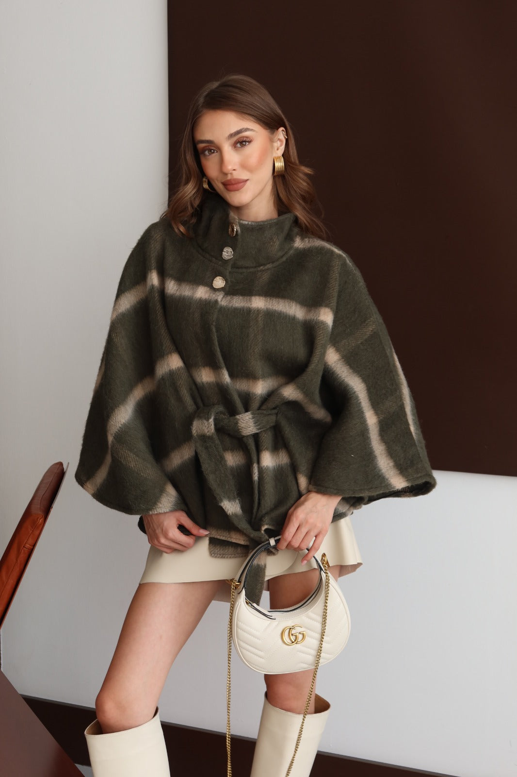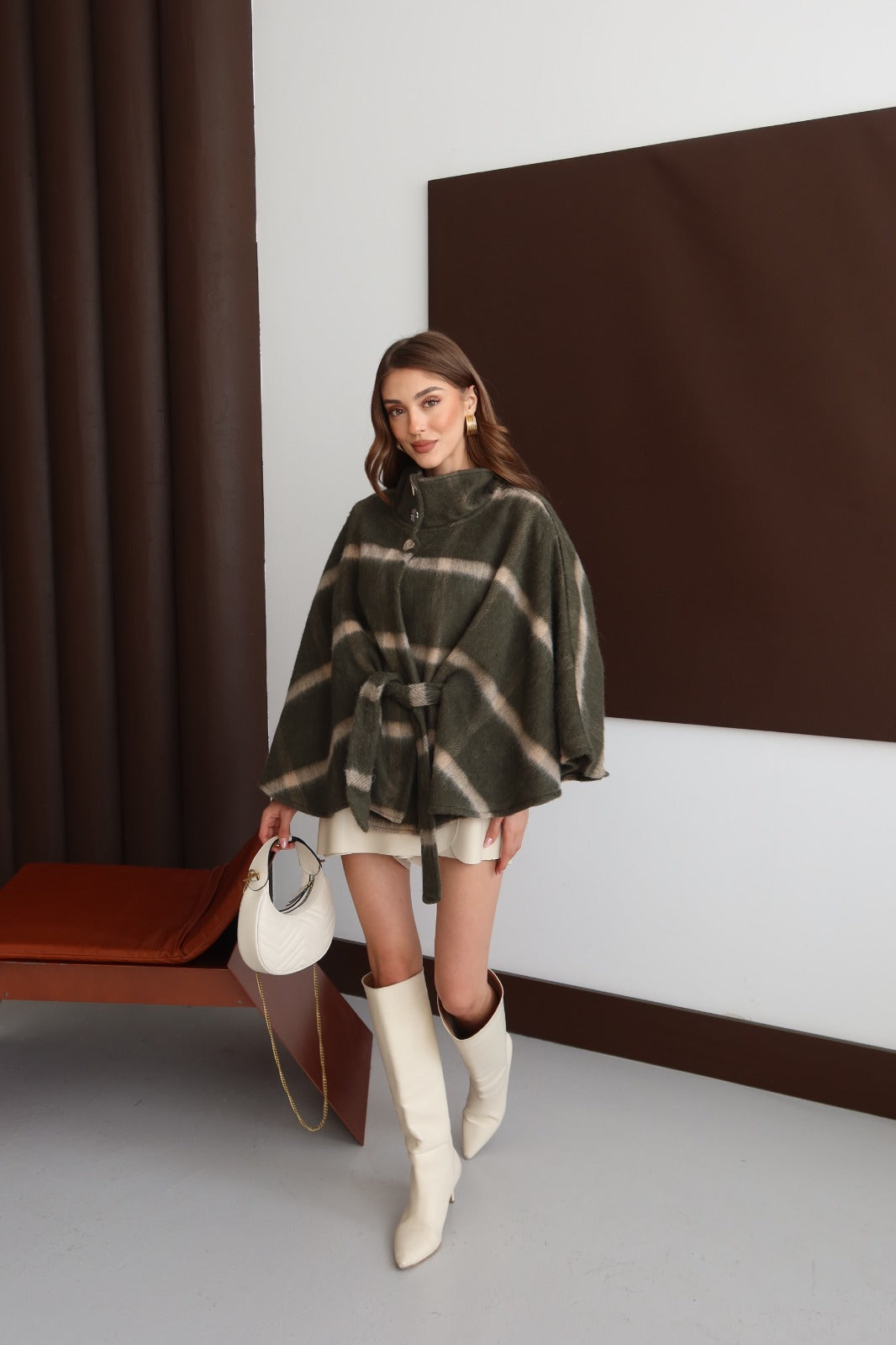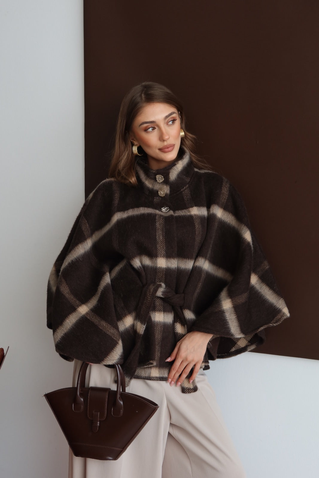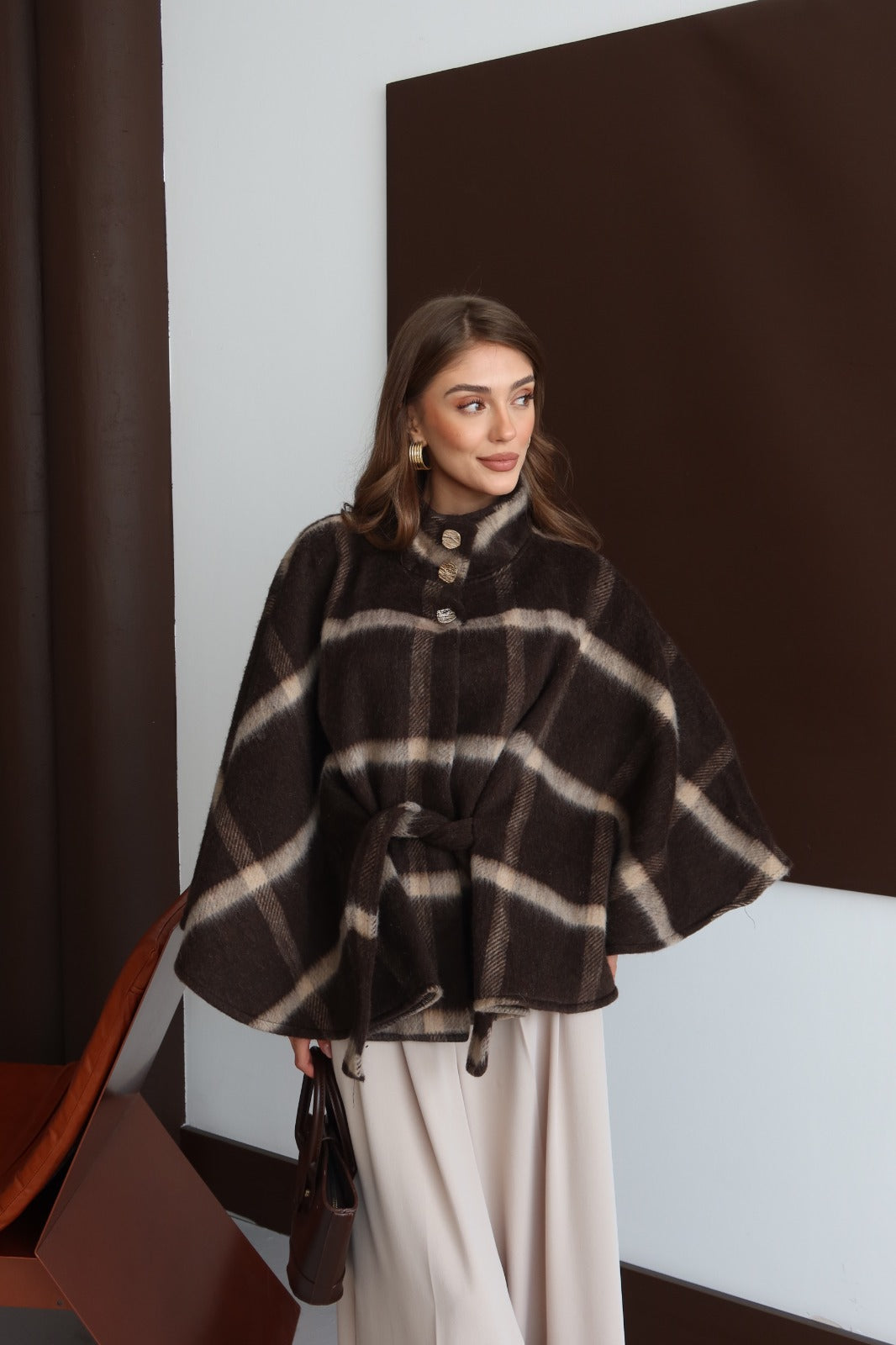 AEC PRIVE kadın gold düğmeli pöti kareli panço, tam da bu zamansız şıklığın vücut bulmuş hâli.