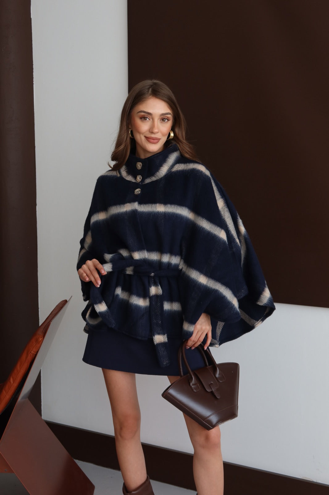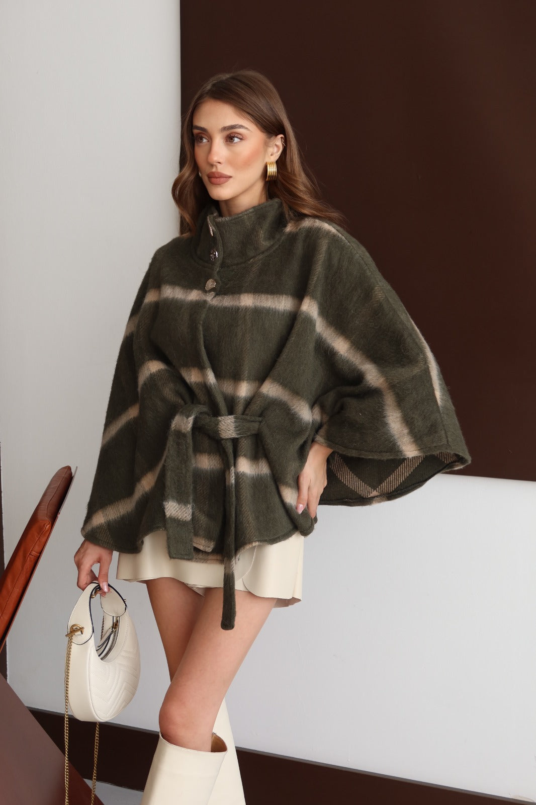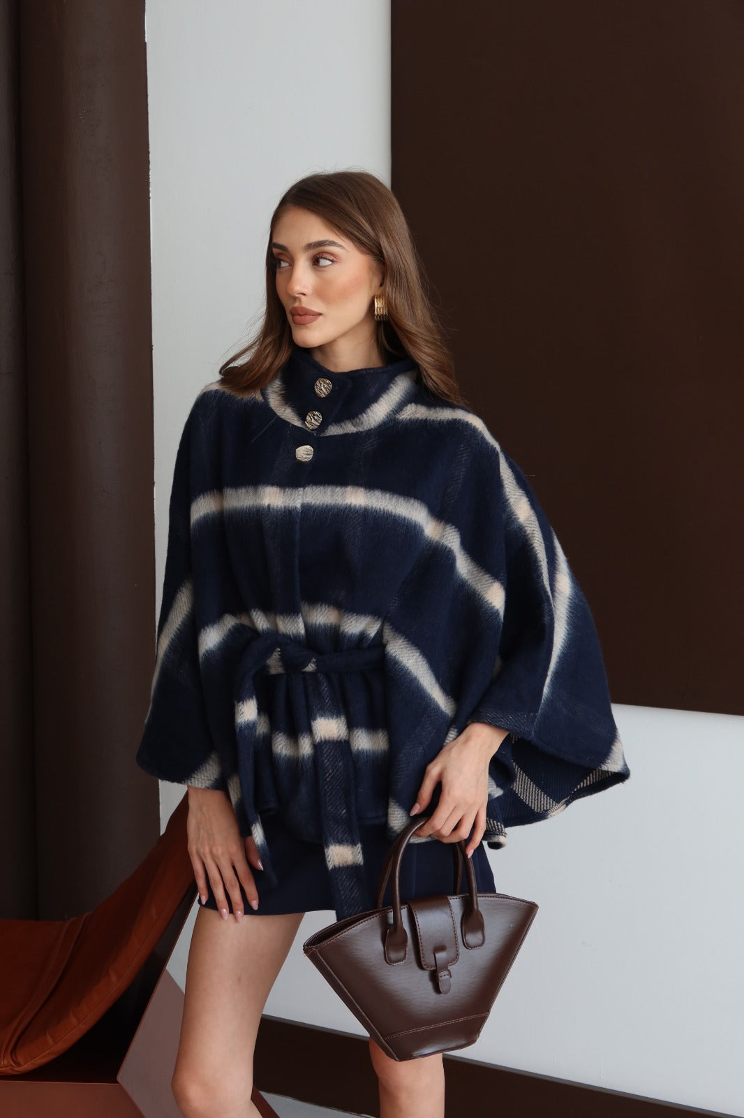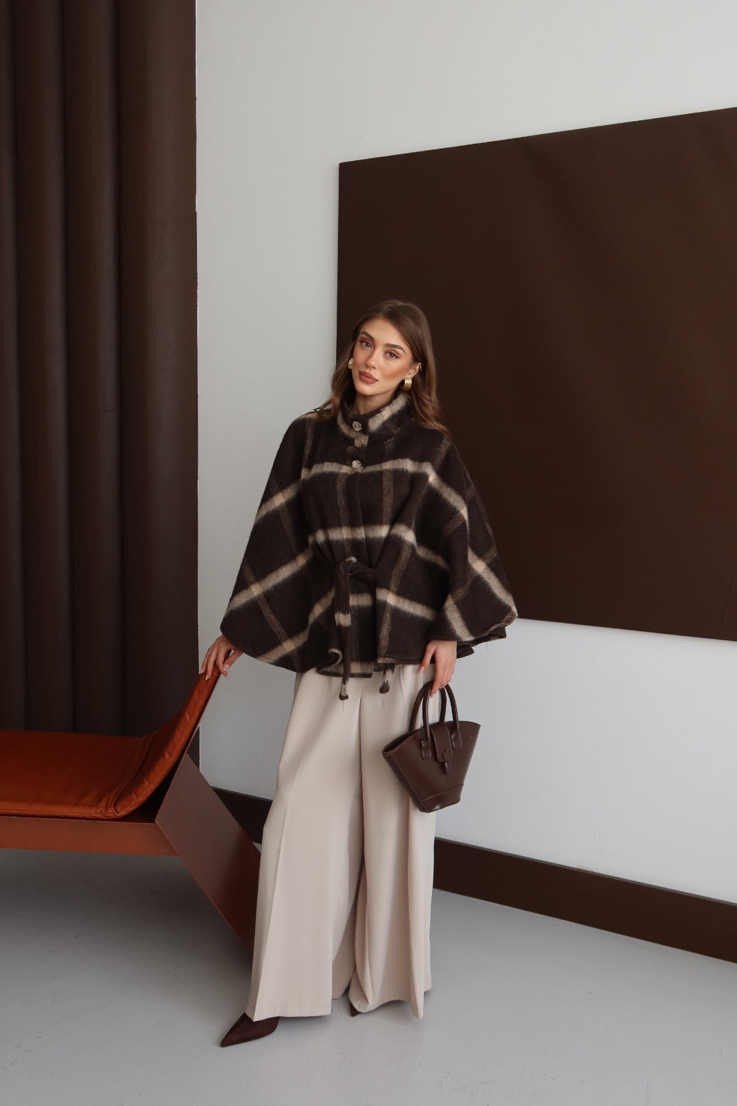AEC PRIVE kadın gold düğmeli pöti kareli panço, tam da bu zamansız şıklığın vücut bulmuş hâli.