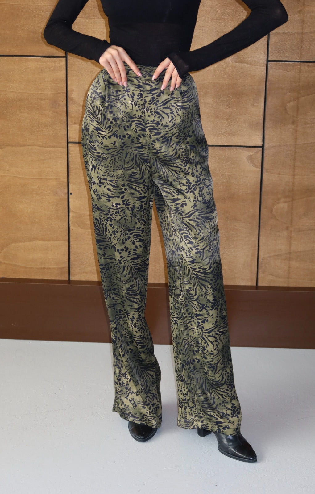 AEC PRIVE’nin kadın yeşil desenli palazzo pantolonu, hem rahatlığı hem de göz alıcı zarafetiyle sezonun en dikkat çeken parçalarından biri.