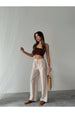 Pantolon, geniş paçaları sayesinde modern bir görünüm yaratırken, rahat kesimi ile hareket özgürlüğü sağlar. Sezonun trendlerine uygun tasarımı ile hem günlük hem de özel günlerde şık bir tercih olacaktır. Bel kısmındaki lastik ve bağcık detayı, vücut hatlarınıza uyum sağlar.