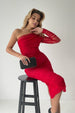 Kırmızı tek kol abiye elbise modelinin üst kısmı, narin tül kumaşıyla dolayı sarmalanmış bir tasarıma sahiptir. Tek kol detayı, abiyeye farklı bir hava katarak göz alıcı bir görünüm sağlar. Midi boyu, elbisenin hem zarif hem de rahat bir şekilde hareket etmenizi sağlar.