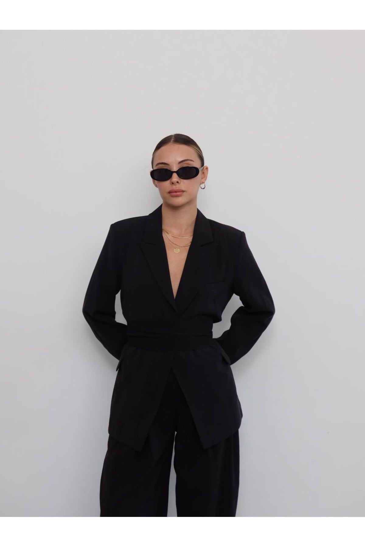 Her mevsim kullanıma uygun tasarımı sayesinde, bu şal detaylı blazer ceket pantolon takım, özel davetlerden iş toplantılarına kadar her ortamda tercih edilebilir. Blazer ceket, stil sahibi görünümünüzü güçlendirir. Pantolon ise geniş kesimiyle özgür hareket etmenizi sağlar.